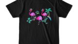 フラミンゴのお散歩のイラストTシャツです。カラー・Pure Color Printの2種類を販売しています。サイズや色の詳細は、グッズの画像をクリックしてご確認ください。