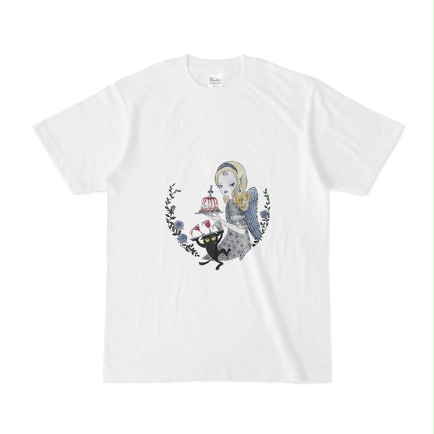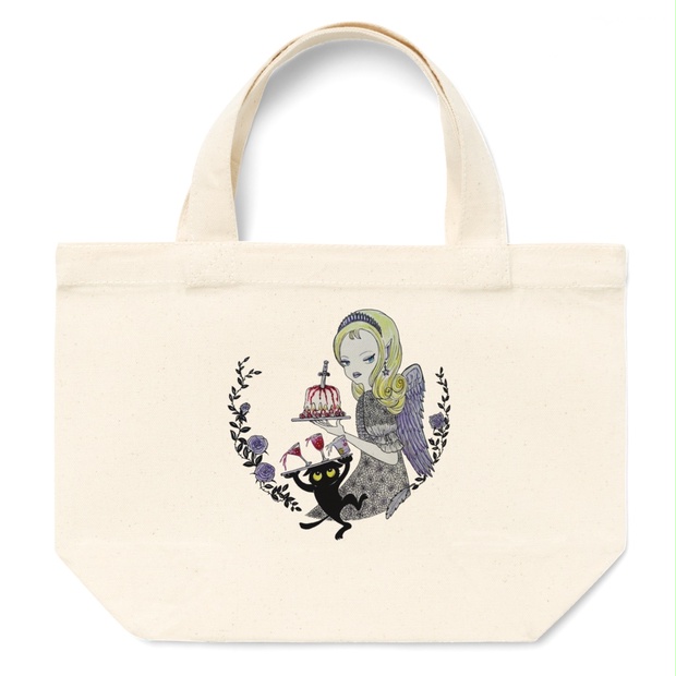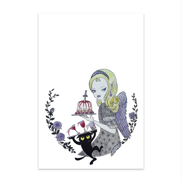 翼を持つ金髪の女性が、黒猫がカクテルを運ぶファンタジーアート「パーティーの準備」 Miジンコ(ミジンコ)